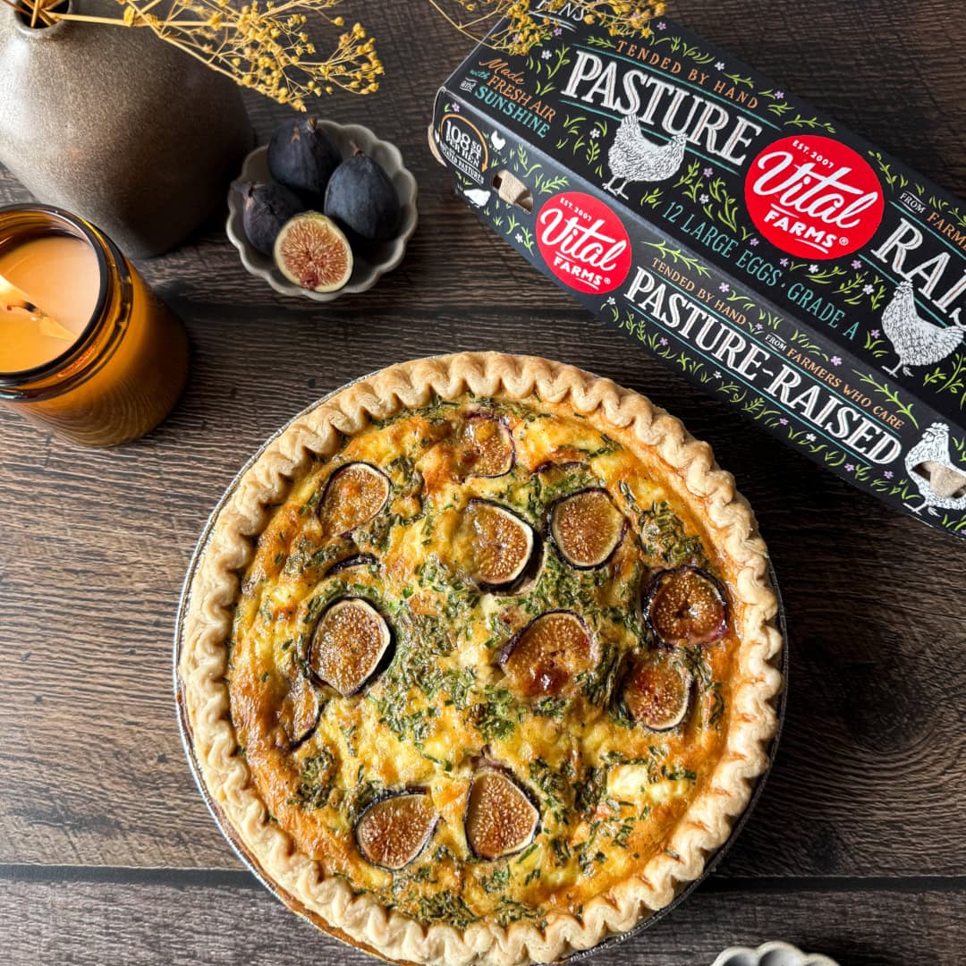 - Pour the egg mixture over the filling and into the pie crust. Top with the remaining goat cheese and fig slices.