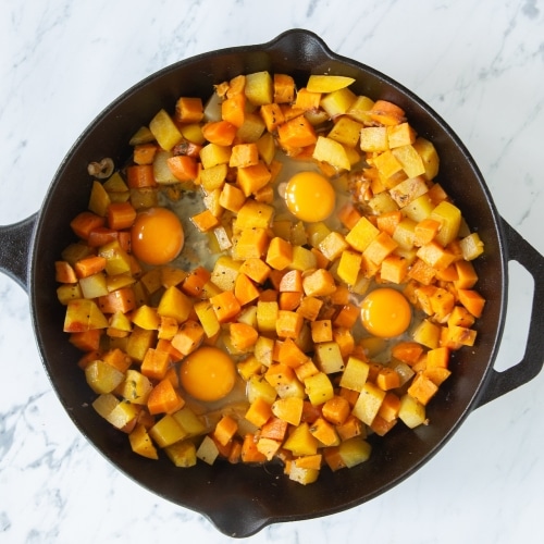 - Make four wells in the hash and crack an egg into each. Re-cover and cook for 6-8 minutes, or until egg whites are set and yolks are cooked to your liking.