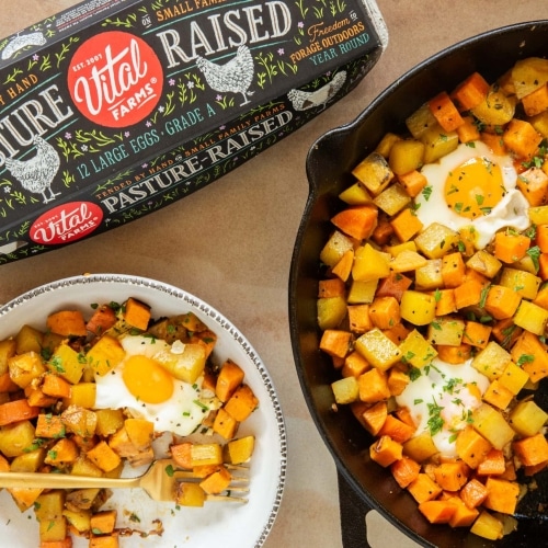 This golden hash shines bright with fresh sweet potatoes, beets and carrots, cooked to perfection. Crack four eggs into the center, garnish with fresh parsley, and enjoy this healthy and delicious one-skillet comfort meal.