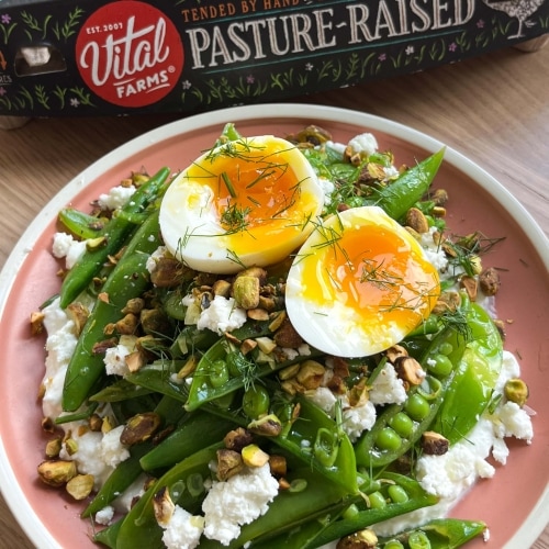 This bright early-season salad places sugar snap peas, toasted pistachios, and chopped fennel fronds atop tangy feta yogurt sauce and finished with a bright, jammy soft-boiled egg.